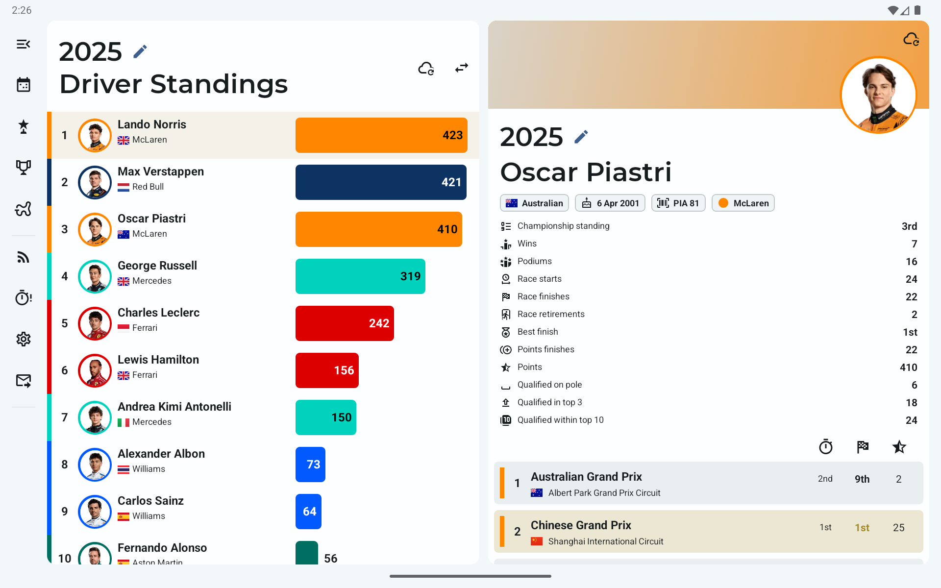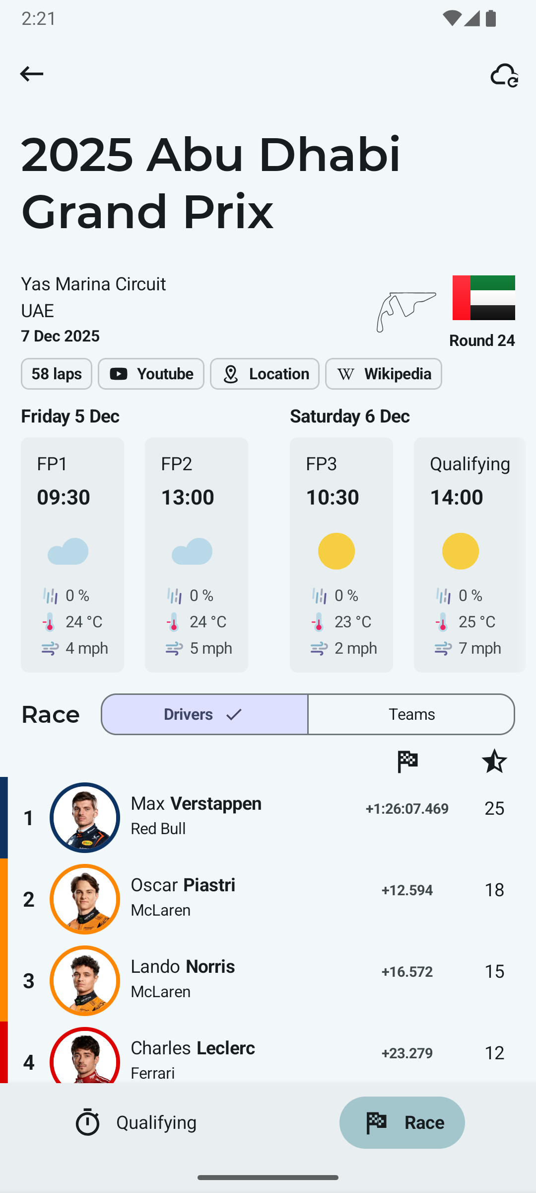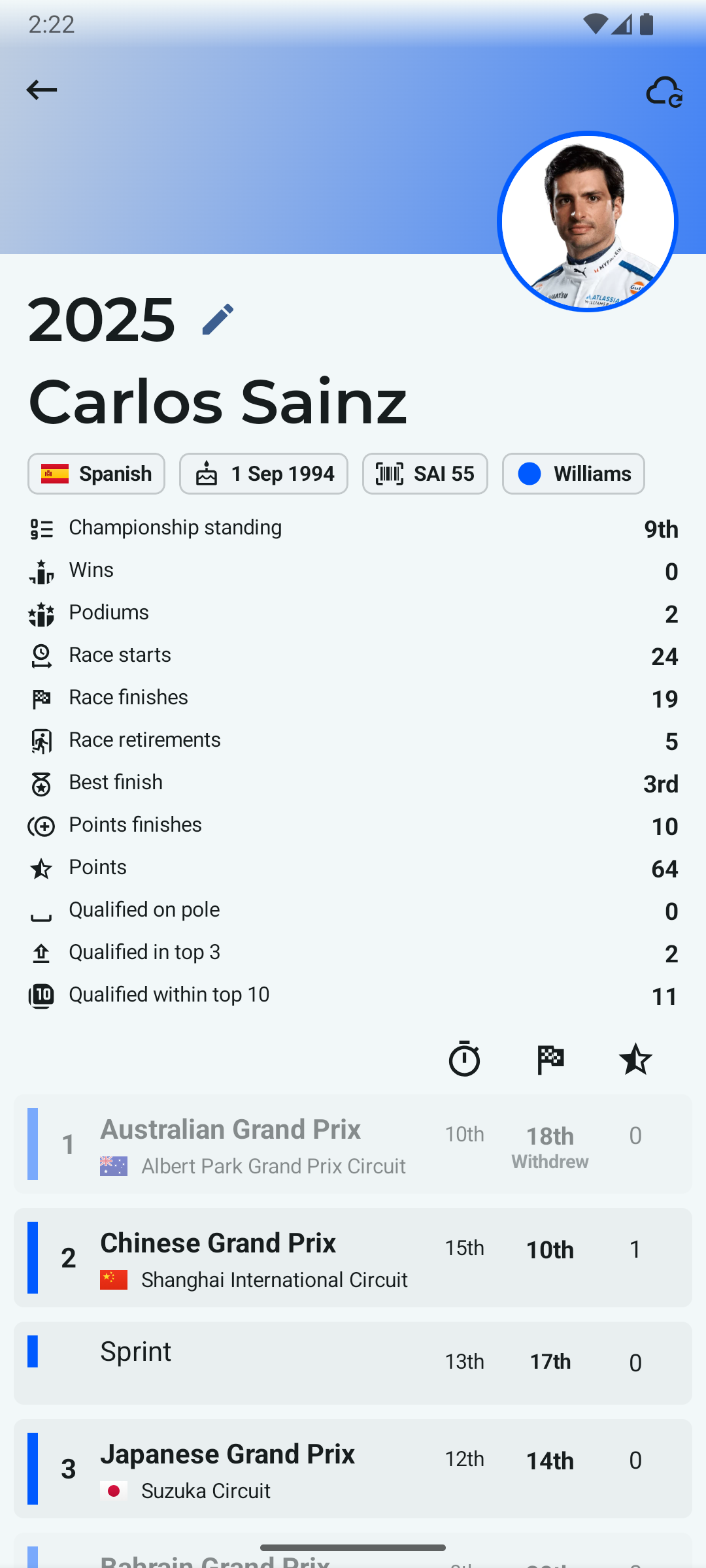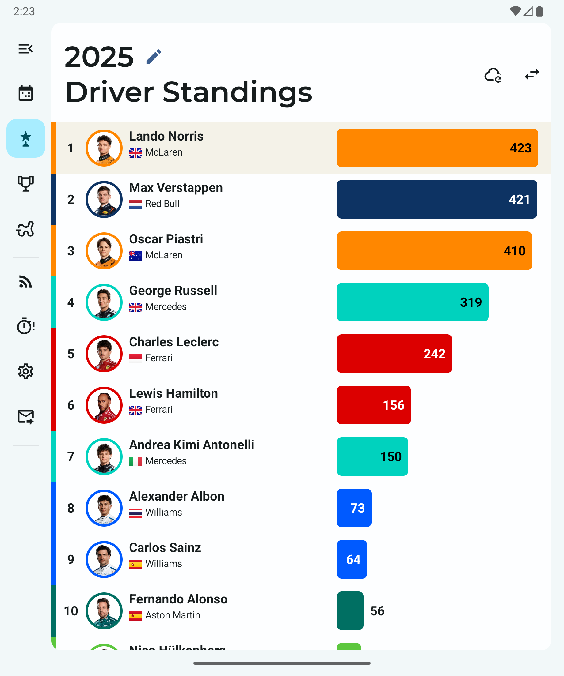 - Sprint shootout and sprint race results up to the latest race