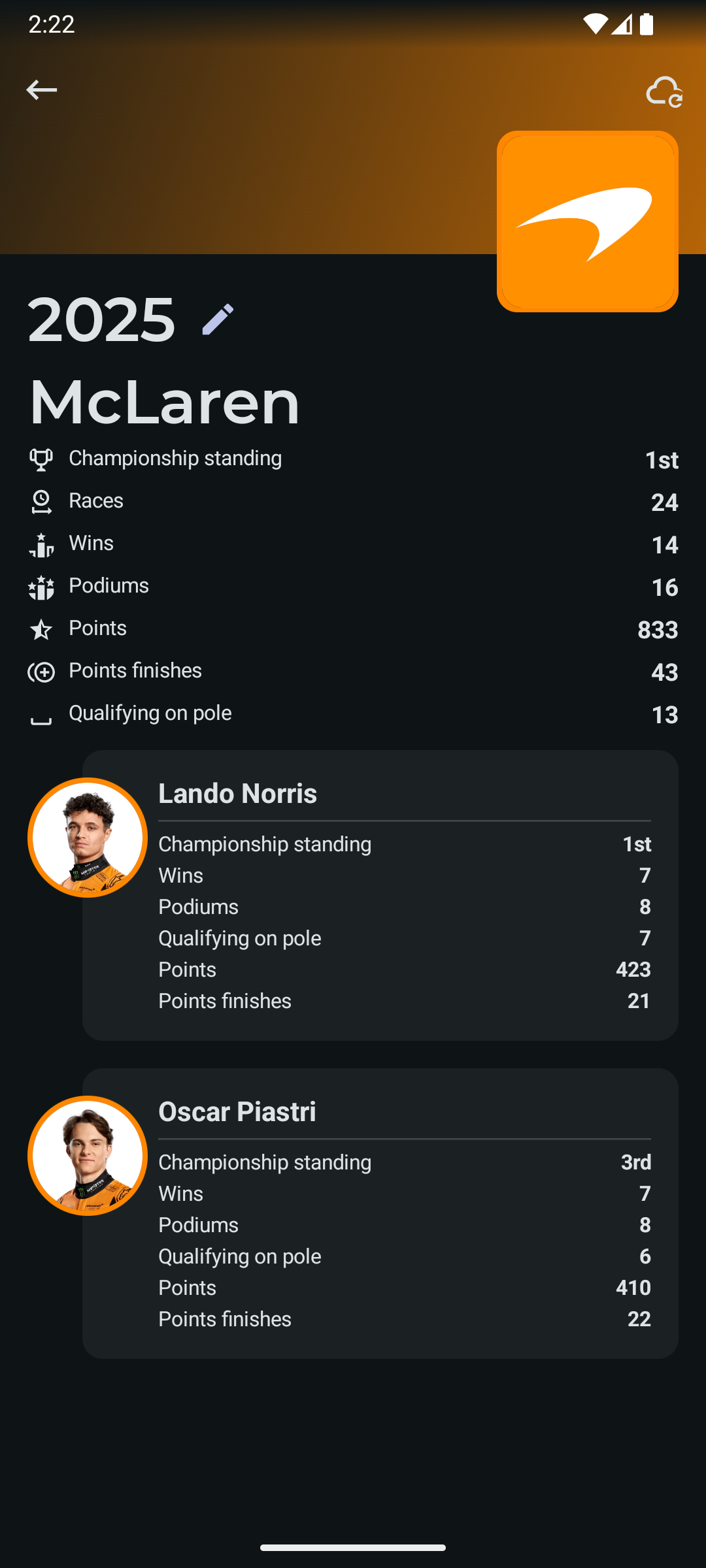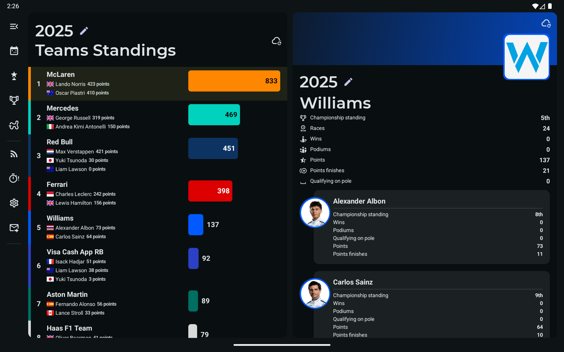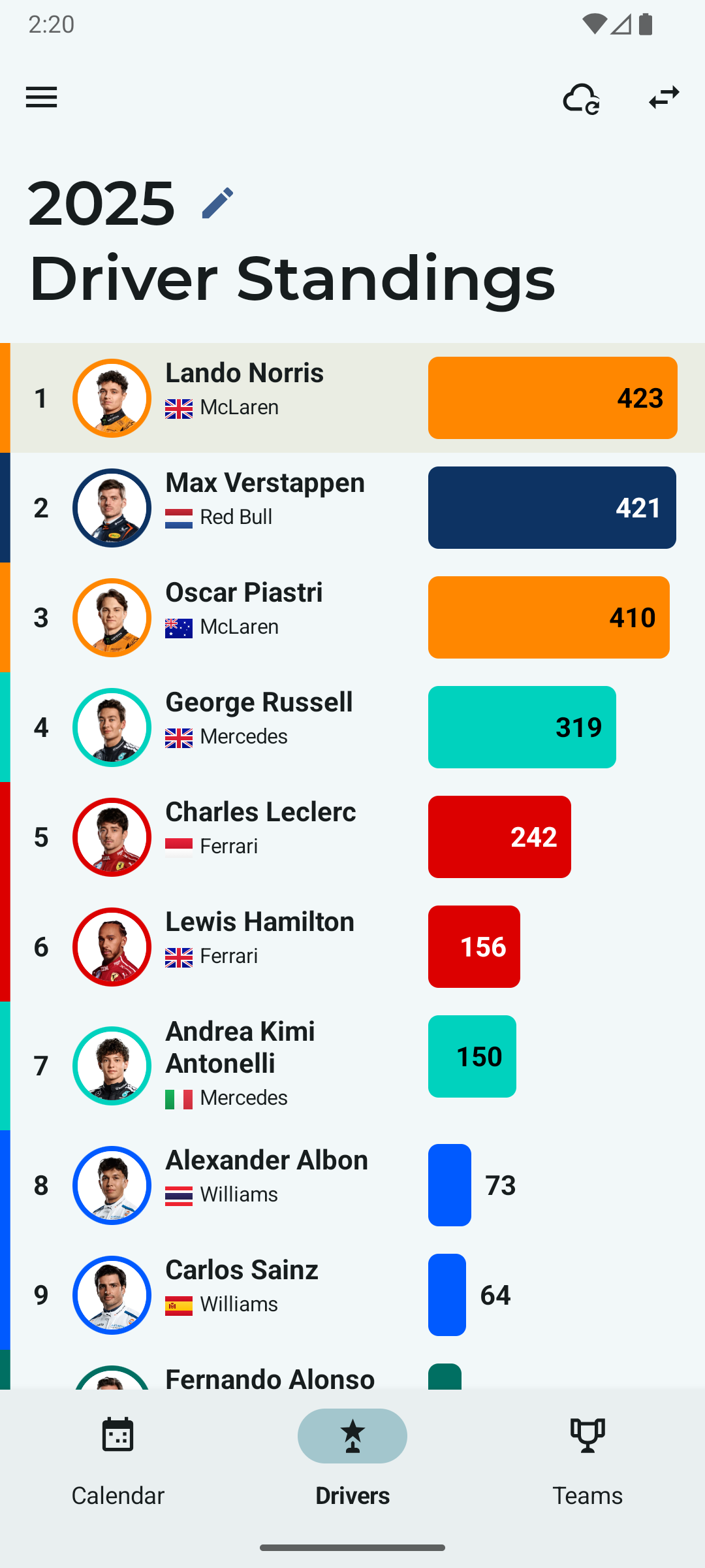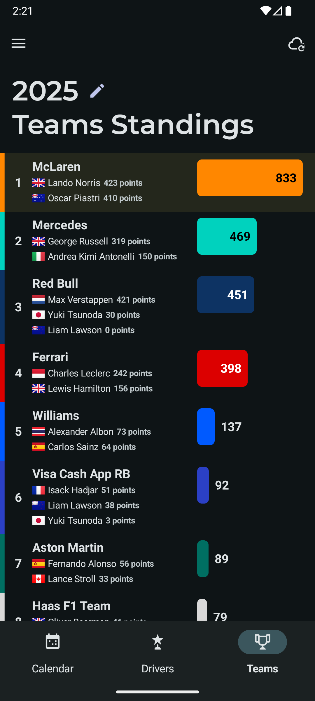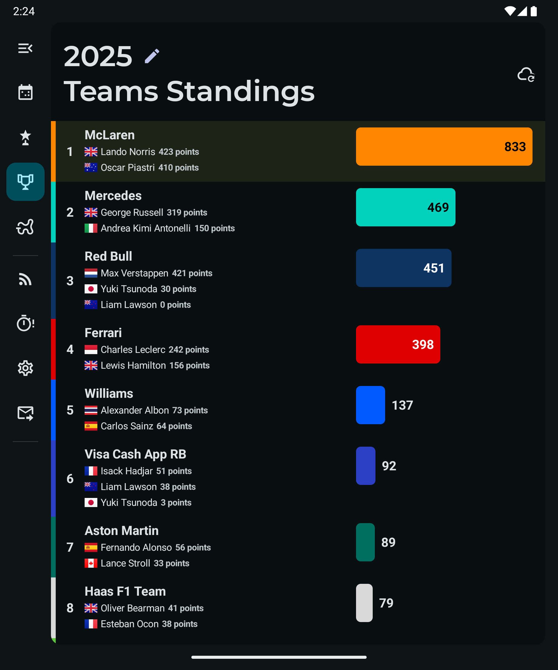 - Sprint shootout and sprint race results up to the latest race