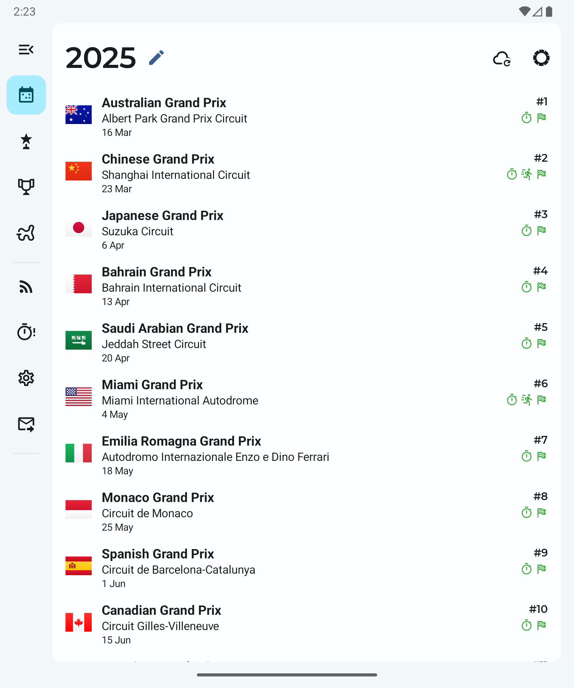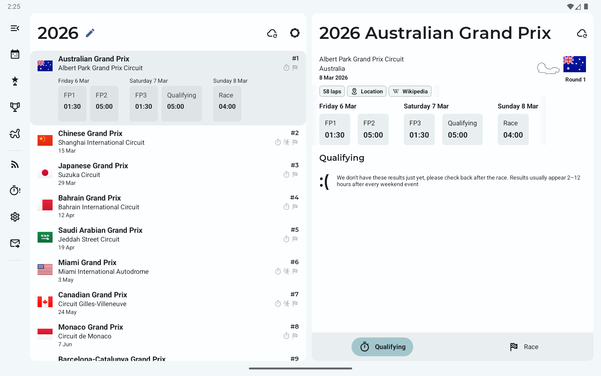 When the season is underway, the calendar for the current year might be subject to change as races are cancelled or rescheduled. As such, data may fail to appear in the app after a race has completed or the upcoming calendar event may not be accurate. We will endeavour to get this resolved as soon as possible!